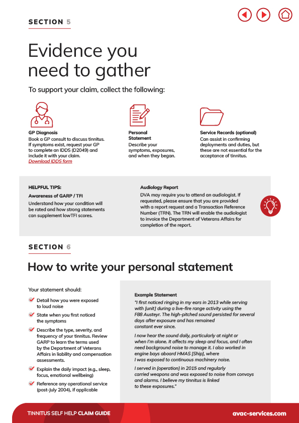 - Service Records (optional): can assist in confirming deployments and duties, but these are not essential for the acceptance of tinnitus.